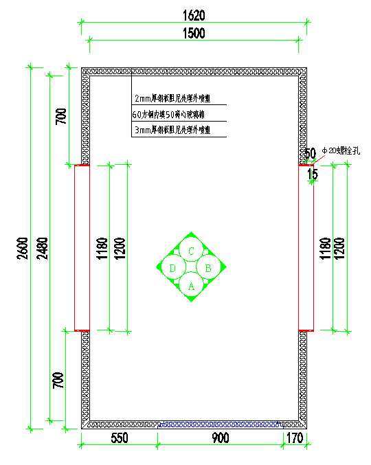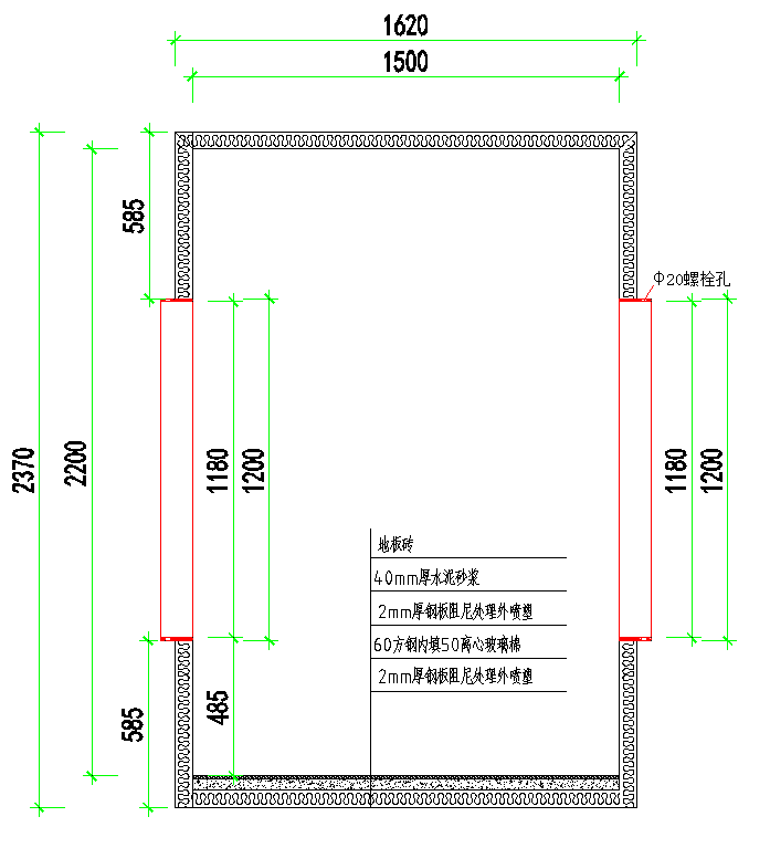 6、 主体构造为外面2mm厚钢板,中间用40×60mm方管做出60mm空腔,内塞50mm厚岩棉,里面装3.0mm厚钢板;