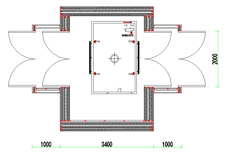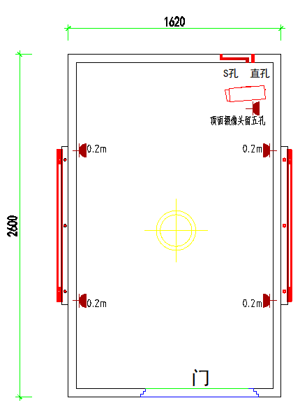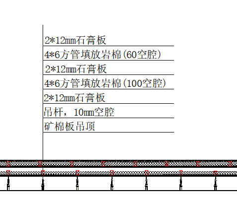 该混响箱内噪声峰值会达到145dB以上,混响箱隔声量在40dB左右,传到混响箱外也会在100dB左右,人员仍不能在这样噪声环境下办公,为减小实验噪声对周围的影响,计划场地布置在无地下室的一楼。在混响箱布置场地砌一间隔声间,主体构造按下图设计,砌筑到屋顶,外侧做铝塑板装饰,内部墙面用聚酯纤维板做吸声,以增加吸声起到辅助隔声的效果。顶部做隔声吊顶,隔声吊顶下做矿棉板吸声,留两盏平板灯。具体构造如图所示: