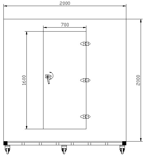 该混响箱为专门定制,客户可以对材料进行吸声测试使用。箱体外形尺寸为2200mm×1800mm×2000mm的长方体,内部尺寸约为1850mm×1450mm×1650mm。底部安装隔振器;整体钢板复合结构,箱体内部安装钢板扩散体。背面留“S”弯20mm粗穿线孔,并预埋电缆,方便使用。