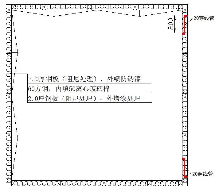 有以上的技术要求,就要求我们在选材时,既要保证箱体的隔声量又不宜选用过于厚重的材料。我们知道,单层均匀介质的隔声复合质量定律,即隔声量与材料的质量成正比,在既要有高隔声量又要限制材料质量的同时我们就要选择轻质复合材料。该箱体选用的是优质钢板为基材的复合结构,内部填充高效吸声材料提高隔声量,周边配木龙骨起框架支撑作用。箱体剖面图如图所示: