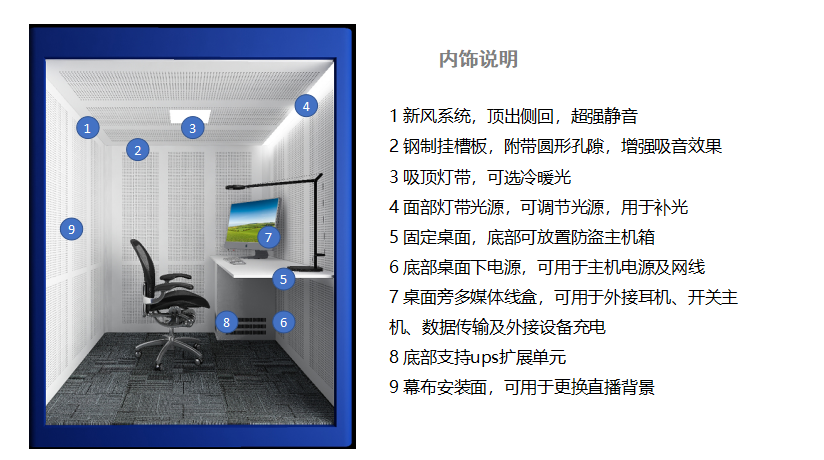 移动直播间是在隔声箱基础的衍生品,具有底本底噪声和通风功能。该直播间具有静音、环保、舒适、安全、可拆卸组装等诸多优点。可以作为直播间、录音棚、阅读室、电话亭、钢琴室、洽谈室、迷你办公室、练歌房等移动屋,隔声间可以根据要求订做各种规格。