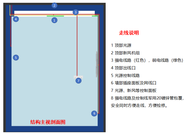 3、顶部出风,下侧回风,保证新风可进入直播间的各个角落,直播间内换气量不低于30m3/h;