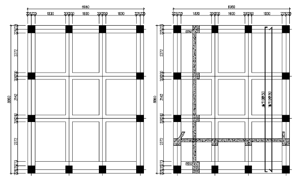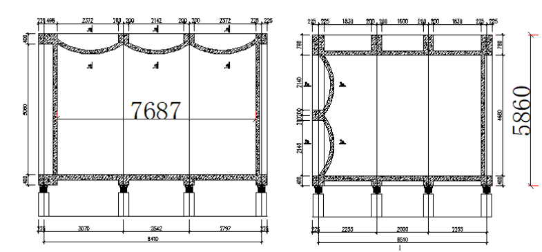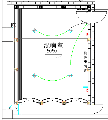 混响室采用弹簧浮筑构造的“房中房”形式,内房外径尺寸为8860×6960×5860mm。地面厚度200mm现浇混凝土,墙面与顶面厚度150mm现浇混凝土。内部地面铺地板砖,墙面使用高光漆或瓷砖。外房南侧和东侧借用先有外墙,窗户做隔声封堵。设计图纸如下所示