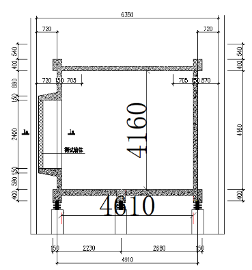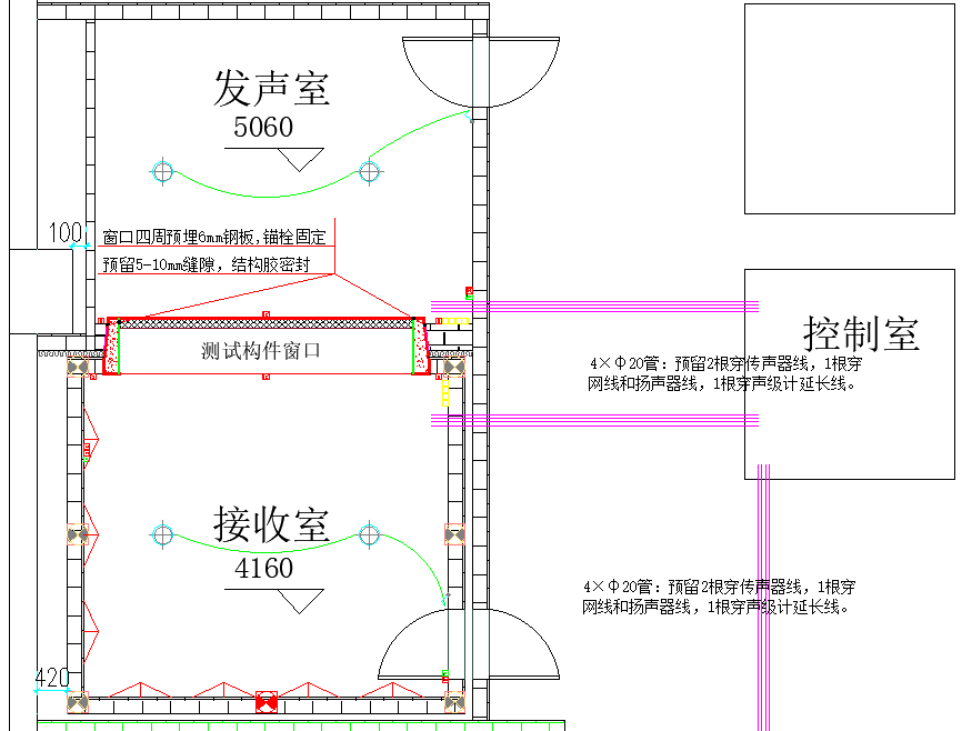隔声室中接收室采用弹簧浮筑构造的“房中房”形式,房内尺寸为5200×4600×4100mm。地面厚度200mm现浇混凝土,墙面与顶面厚度150mm现浇混凝土。内部地面铺地板砖,墙面使用高光漆,墙面与顶面悬挂吸声体与扩散体,调节接收室的混响时间和声场分布。发声室整体采用现浇构造,容积略大于接收室,门使用背对背开启的双层隔声门。隔声与混响室公用一侧外墙。设计图纸如下所示