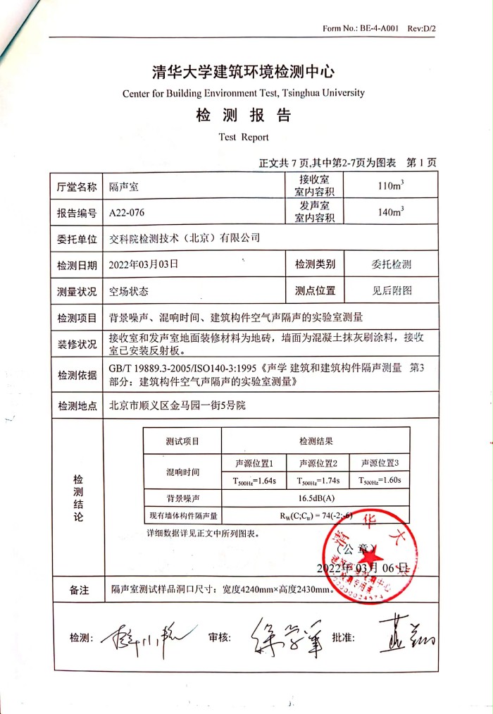 室内的声场和混响时间满足 GB/T 19889.1-2005《声学建筑和建筑构件隔声测量》中对隔声室的要求。